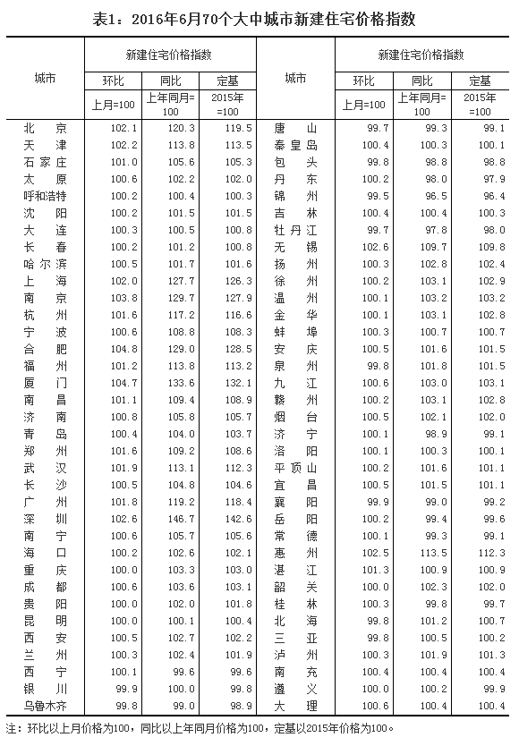 2016年6月份70個大中城市住宅銷售價格變動情況