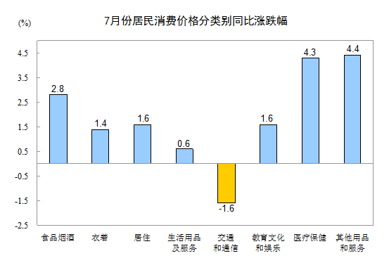 7月份,其他七大類價格同比六漲一降。其中,其他用品和服務、醫療保健、居住、教育文化和娛樂、衣著、生活用品及服務價格分別上漲4.4%、4.3%、1.6%、1.6%、1.4%、0.6%;交通和通信價格下降1.6%。