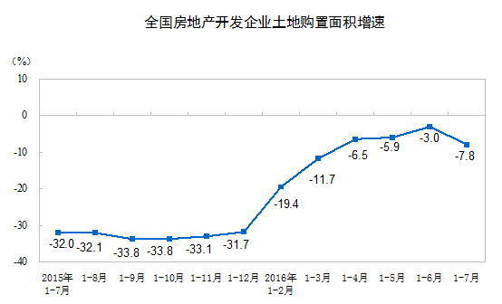 1-7月份,房地產開發企業土地購置面積11167萬平方米,同比下降7.8%,降幅比1-6月份擴大4.8個百分點;土地成交價款3848億元,增長7.1%,增速回落3.1個百分點。