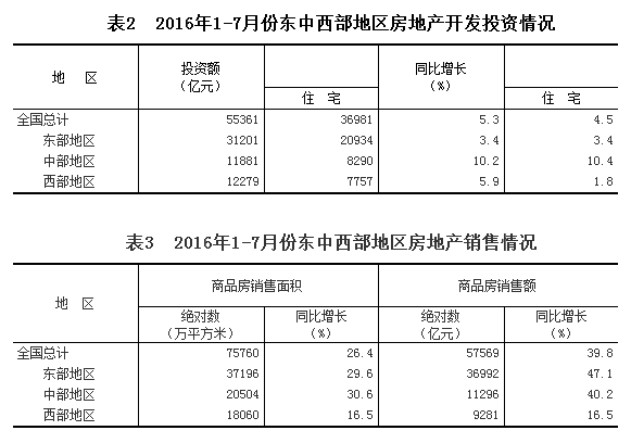 1-7月份,東部地區房地產開發投資31201億元,同比增長3.4%,增速比1-6月份回落1.2個百分點;中部地區投資11881億元,增長10.2%,增速提高0.2個百分點;西部地區投資12279億元,增長5.9%,增速回落0.6個百分點。
