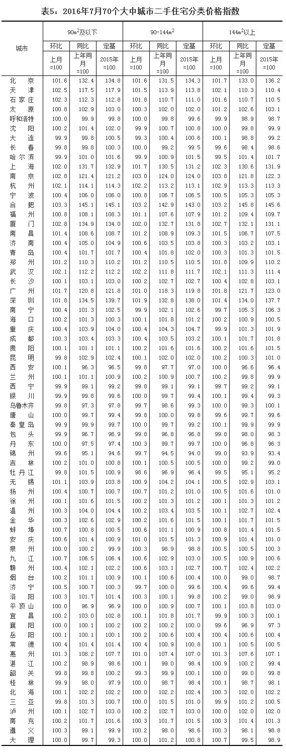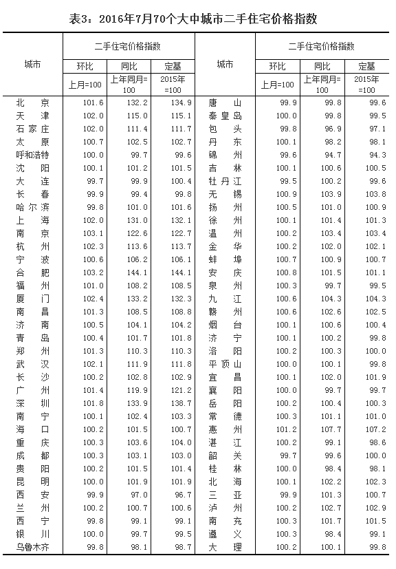 2016年7月份70個大中城市住宅銷售價格變動情況
