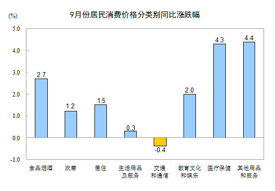 9月份,其他七大類價格同比六漲一降。其中,其他用品和服務、醫療保健、教育文化和娛樂、居住、衣著、生活用品及服務價格分別上漲4.4%、4.3%、2.0%、1.5%、1.2%、0.3%;交通和通信價格下降0.4%。