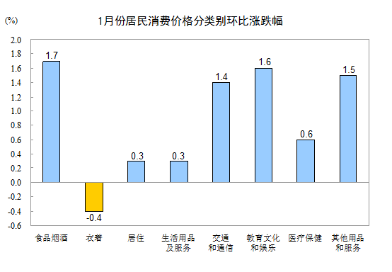 1月份,其他七大類價格環(huán)比六漲一降。其中,教育文化和娛樂、其他用品和服務(wù)、交通和通信、醫(yī)療保健、居住、生活用品及服務(wù)價格分別上漲1.6%、1.5%、1.4%、0.6%、0.3%和0.3%;衣著價格下降0.4%。