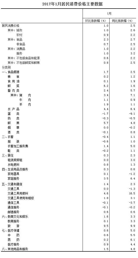 2017年1月份,全國居民消費價格總水平同比上漲2.5%。其中,城市上漲2.6%,農(nóng)村上漲2.2%;食品價格上漲2.7%,非食品價格上漲2.5%;消費品價格上漲2.2%,服務(wù)價格上漲3.2%。