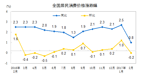 2017年2月份,全國居民消費價格總水平同比上漲0.8%。其中,城市上漲0.9%,農村上漲0.6%;食品價格下降4.3%,非食品價格上漲2.2%;消費品價格下降0.1%,服務價格上漲2.4%。1-2月平均,全國居民消費價格總水平比去年同期上漲1.7%。