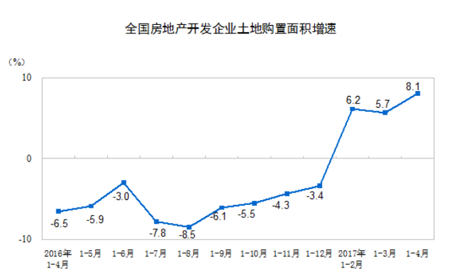 1-4月份,房地產(chǎn)開發(fā)企業(yè)土地購(gòu)置面積5528萬(wàn)平方米,同比增長(zhǎng)8.1%,增速比1-3月份提高2.4個(gè)百分點(diǎn);土地成交價(jià)款2104億元,增長(zhǎng)34.2%,增速提高17.5個(gè)百分點(diǎn)。