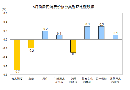 6月份,全國居民消費價格環比下降0.2%。其中,城市下降0.1%,農村下降0.2%;食品價格下降1.0%,非食品價格上漲0.1%;消費品價格下降0.4%,服務價格上漲0.3%。