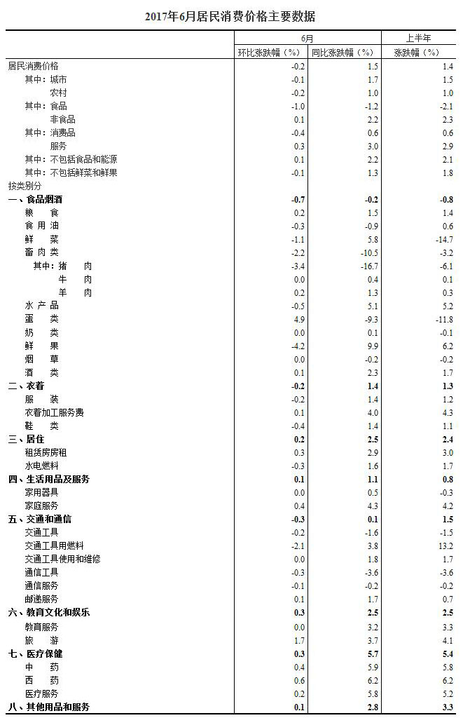 2017年6月份,全國居民消費價格同比上漲1.5%。其中,城市上漲1.7%,農村上漲1.0%;食品價格下降1.2%,非食品價格上漲2.2%;消費品價格上漲0.6%,服務價格上漲3.0%。上半年,全國居民消費價格總水平比去年同期上漲1.4%。