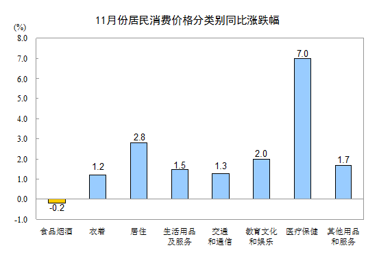 11月份,其他七大類價格同比均上漲。其中,醫(yī)療保健、居住、教育文化和娛樂價格分別上漲7.0%、2.8%和2.0%,其他用品和服務(wù)、生活用品及服務(wù)價格分別上漲1.7%和1.5%,交通和通信、衣著價格分別上漲1.3%和1.2%。