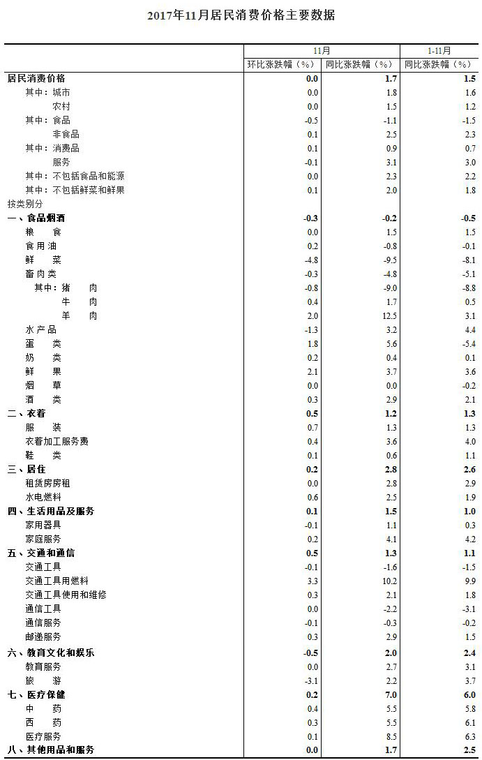 2017年11月份居民消費(fèi)價格同比上漲1.7%