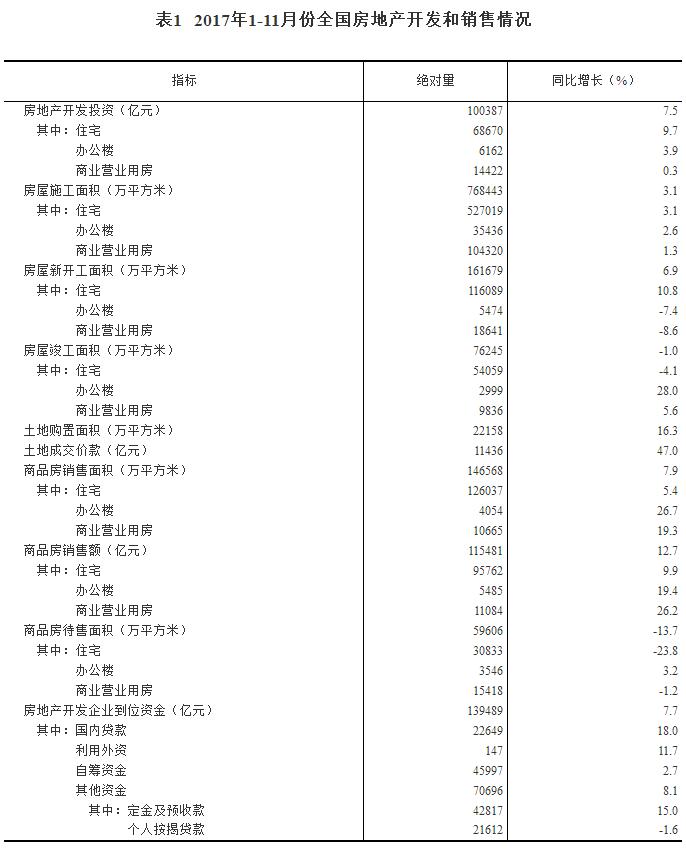 20171-11月份,全國房地產開發投資100387億元,同比名義增長7.5%,增速比1-10月份回落0.3個百分點。其中,住宅投資68670億元,增長9.7%,增速回落0.2個百分點。住宅投資占房地產開發投資的比重為68.4%
