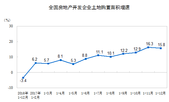 2017年,房地產(chǎn)開發(fā)企業(yè)土地購置面積25508萬平方米,比上年增長15.8%,增速比1-11月份回落0.5個百分點;土地成交價款13643億元,增長49.4%,增速提高2.4個百分點。