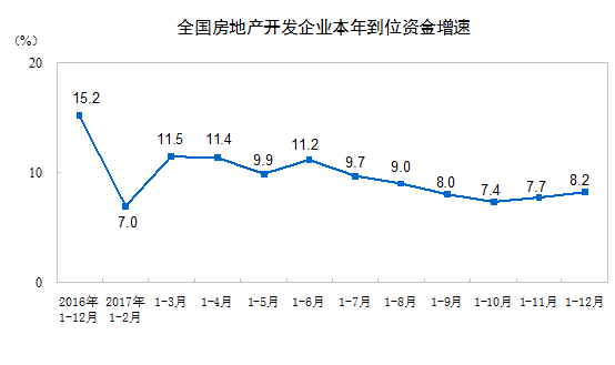 2017年,房地產(chǎn)開發(fā)企業(yè)到位資金156053億元,比上年增長8.2%,增速比1-11月份提高0.5個百分點。其中,國內(nèi)貸款25242億元,增長17.3%;利用外資168億元,增長19.8%;自籌資金50872億元,增長3.5%;其他資金79770億元,增長8.6%。在其他資金中,定金及預(yù)收款48694億元,增長16.1%;個人按揭貸款23906億元,下降2.0%。