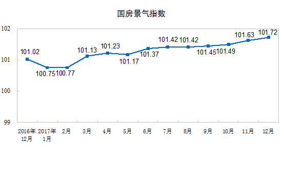 12月份,房地產(chǎn)開發(fā)景氣指數(shù)(簡稱“國房景氣指數(shù)”)為101.72,比11月份提高0.09點。