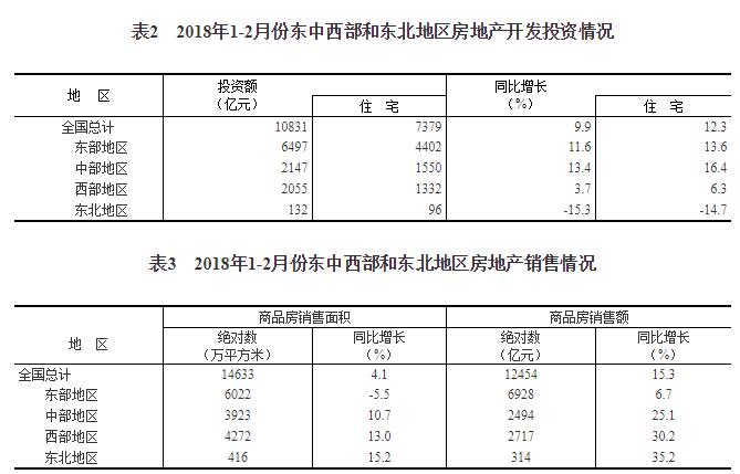 1-2月份,東部地區房地產開發投資6497億元,同比增長11.6%,增速比去年全年提高4.4個百分點;中部地區投資2147億元,增長13.4%,增速提高1.8個百分點;西部地區投資2055億元,增長3.7%,增速提高0.2個百分點;東北地區投資132億元,下降15.3%,去年全年為增長1.0%。