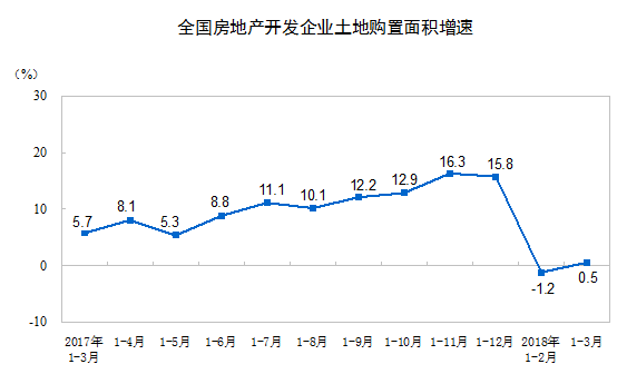 1-3月份,房地產開發企業土地購置面積3802萬平方米,同比增長0.5%,1-2月份為下降1.2%;土地成交價款1634億元,增長20.3%,增速提高20.3個百分點。