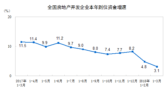 1-3月份,房地產開發企業到位資金36770億元,同比增長3.1%,增速比1-2月份回落1.7個百分點。其中,國內貸款6957億元,增長0.9%;利用外資16億元,下降78.4%;自籌資金11449億元,增長5.1%;定金及預收款11130億元,增長11.2%;個人按揭貸款5160億元,下降6.8%。