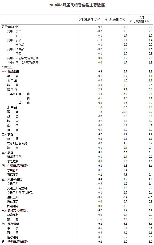 2018年5月份,全國居民消費價格同比上漲1.8%。其中,城市上漲1.8%,農村上漲1.7%;食品價格上漲0.1%,非食品價格上漲2.2%;消費品價格上漲1.3%,服務價格上漲2.5%。1-5月平均,全國居民消費價格比去年同期上漲2.0%。