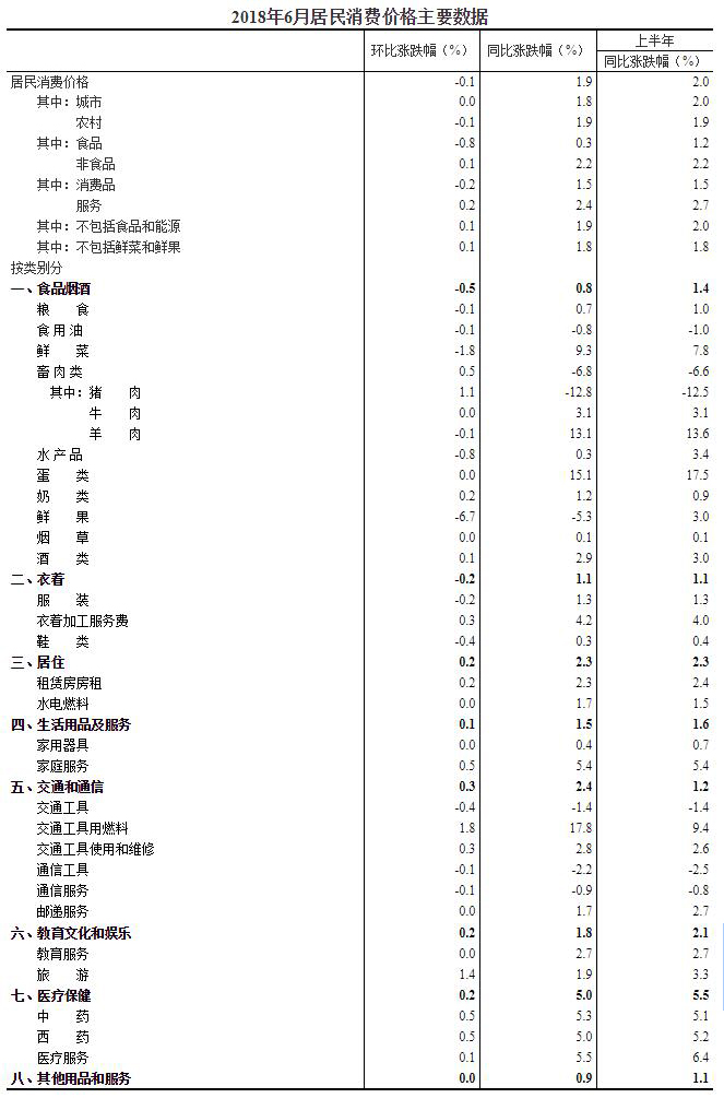 2018年6月份,全國居民消費價格同比上漲1.9%。其中,城市上漲1.8%,農村上漲1.9%;食品價格上漲0.3%,非食品價格上漲2.2%;消費品價格上漲1.5%,服務價格上漲2.4%。上半年,全國居民消費價格比去年同期上漲2.0%。