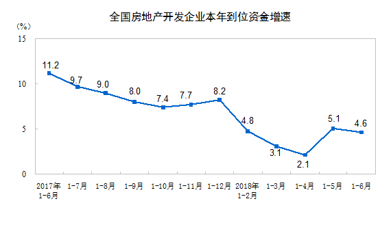 1-6月份,房地產(chǎn)開發(fā)企業(yè)到位資金79287億元,同比增長4.6%,增速比1-5月份回落0.5個百分點。其中,國內(nèi)貸款12292億元,下降7.9%;利用外資28億元,下降73.1%;自籌資金25541億元,增長9.7%;定金及預收款26123億元,增長12.5%;個人按揭貸款11524億元,下降4.0%。
