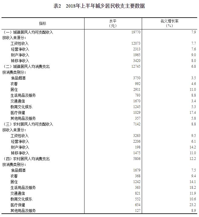 2018年上半年居民收入和消費支出情況