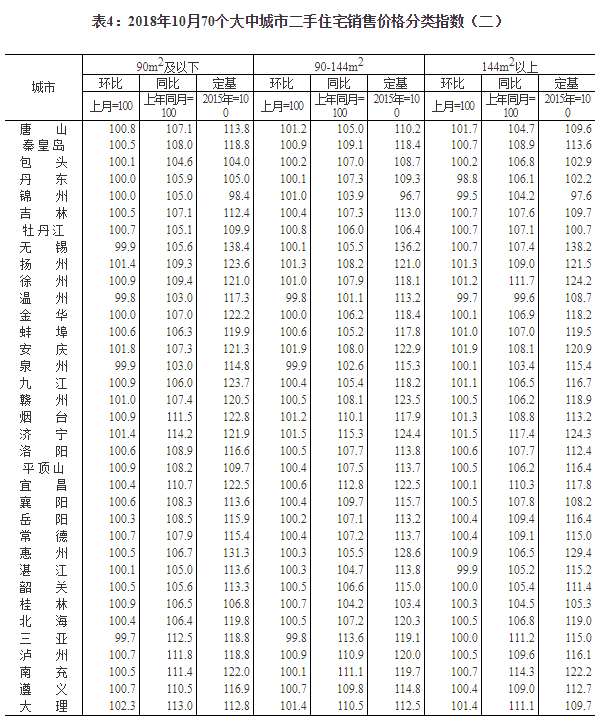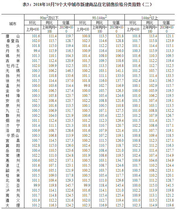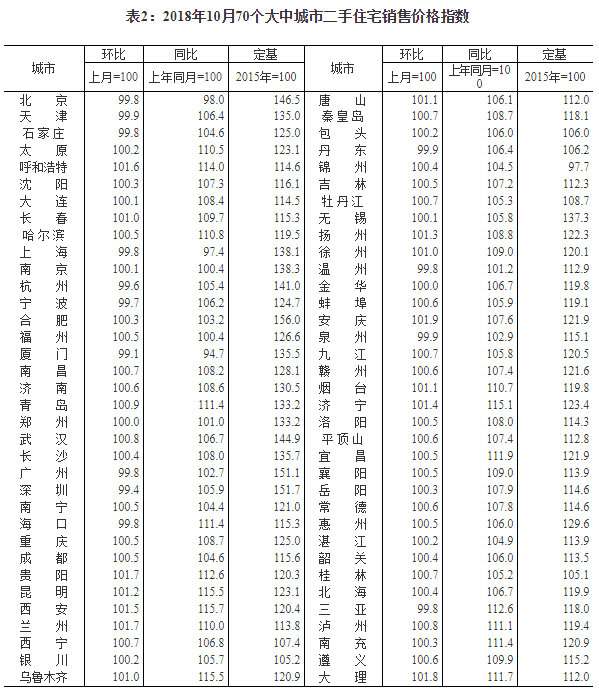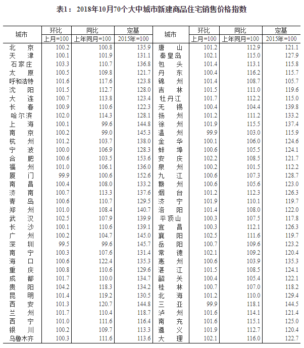 2018年10月份70個大中城市商品住宅銷售價格變動情況