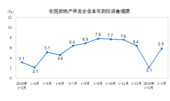 1-3月份,房地產(chǎn)開發(fā)企業(yè)到位資金38948億元,同比增長5.9%,增速比1-2月份提高3.8個百分點。其中,國內(nèi)貸款7134億元,增長2.5%;利用外資33億元,增長1.1倍;自籌資金11795億元,增長3.0%;定金及預(yù)收款12303億元,增長10.5%;個人按揭貸款5645億元,增長9.4%。