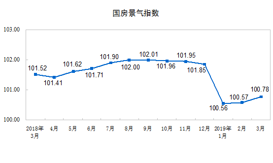 3月份,房地產(chǎn)開發(fā)景氣指數(shù)(簡稱“國房景氣指數(shù)”)為100.78,比2018年2月份回落0.21點。