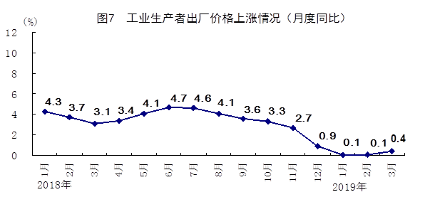 一季度,全國工業生產者出廠價格同比上漲0.2%,漲幅比1-2月份擴大0.1個百分點,比上年同期回落3.5個百分點。3月份,全國工業生產者出廠價格同比上漲0.4%,漲幅比上月擴大0.3個百分點;環比上漲0.1%。一季度,全國工業生產者購進價格同比上漲0.1%,其中3月份同比上漲0.2%,環比持平。