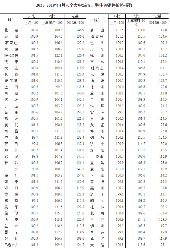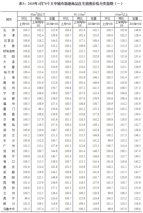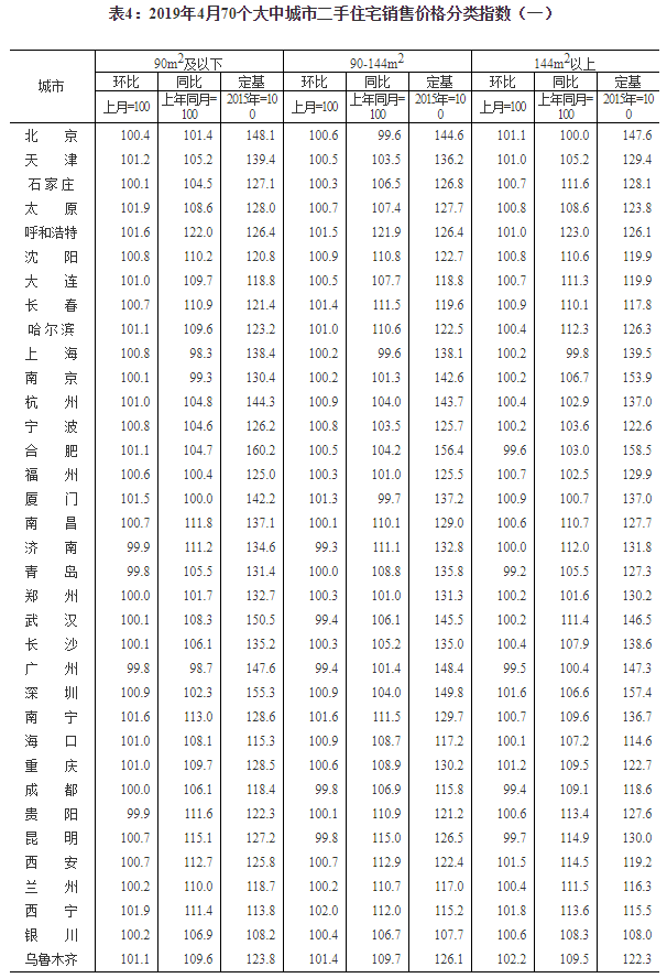 2019年4月份70個大中城市商品住宅銷售價格變動情況