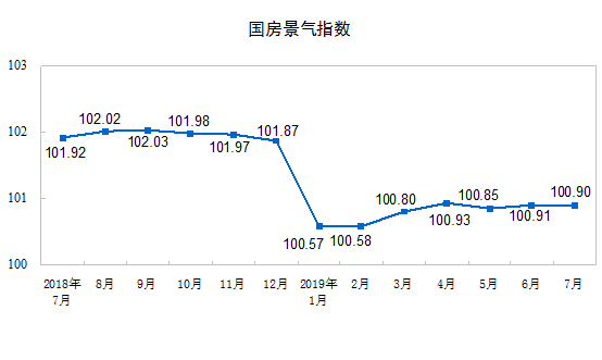 7月份,房地產開發景氣指數(簡稱“國房景氣指數”)為100.90,比6月份回落0.01點。