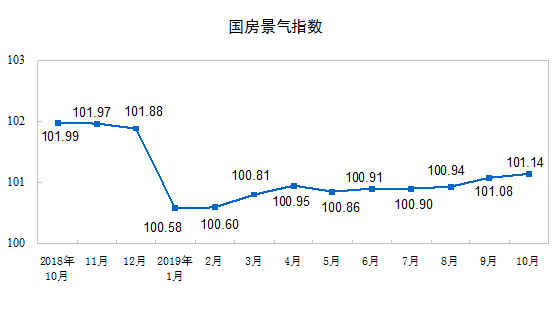 10月份,房地產開發景氣指數(簡稱“國房景氣指數”)為101.14,比9月份提高0.06點。