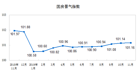 11月份,房地產開發景氣指數(簡稱“國房景氣指數”)為101.16,比10月份提高0.02點。