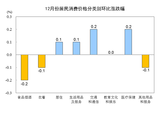12月份,全國居民消費價格環(huán)比持平。其中,城市持平,農(nóng)村下降0.1%;食品價格下降0.4%,非食品價格上漲0.1%;消費品和服務(wù)價格均持平。