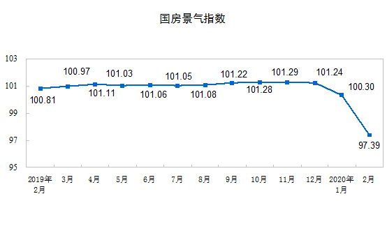 2月份,房地產開發景氣指數(簡稱“國房景氣指數”)為97.39。