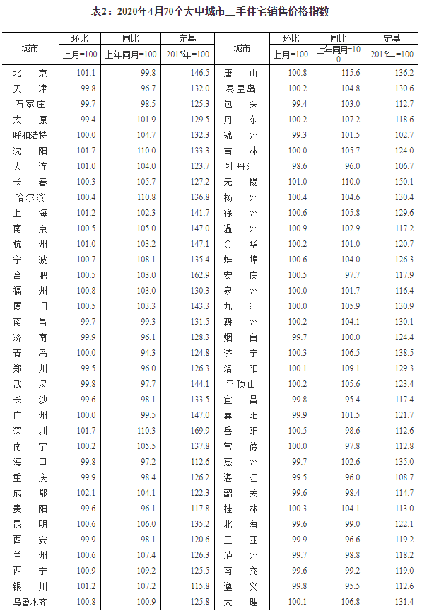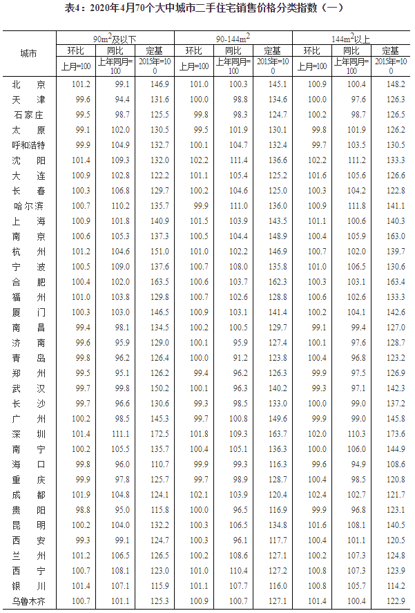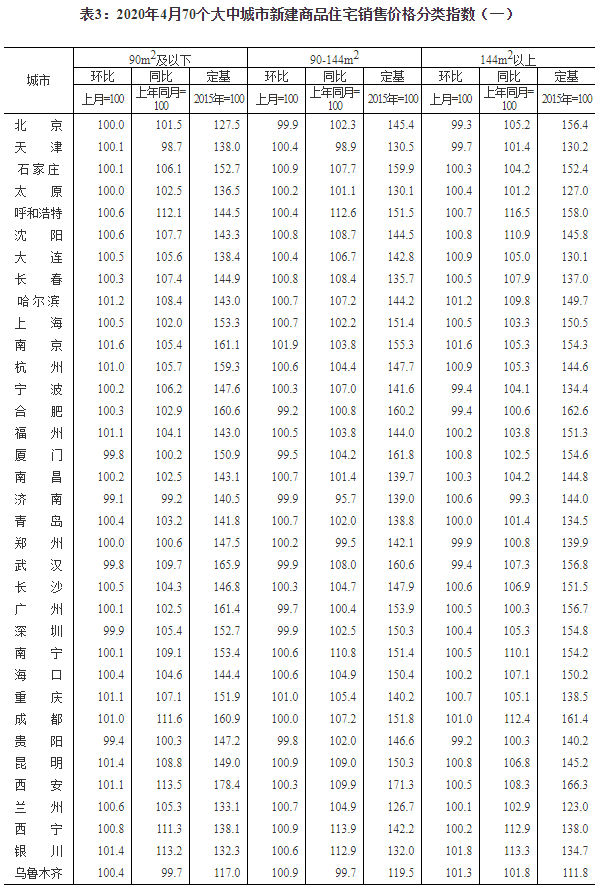 2020年4月份70個大中城市商品住宅銷售價格變動情況