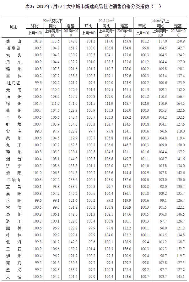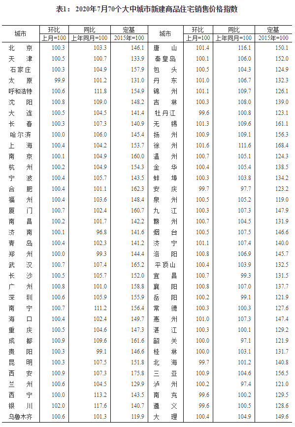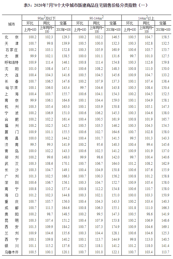 2020年7月份70個大中城市商品住宅銷售價格變動情況