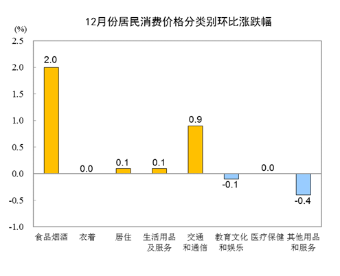 12月份,全國居民消費價格環(huán)比上漲0.7%。其中,城市上漲0.7%,農村上漲0.9%;食品價格上漲2.8%,非食品價格上漲0.1%;消費品價格上漲1.2%,服務價格持平。
