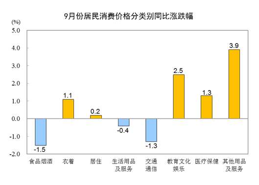9月份,全國(guó)居民消費(fèi)價(jià)格環(huán)比上漲0.2%。其中,城市上漲0.2%,農(nóng)村上漲0.3%;食品價(jià)格上漲0.3%,非食品價(jià)格上漲0.2%;消費(fèi)品價(jià)格上漲0.4%,服務(wù)價(jià)格下降0.1%。