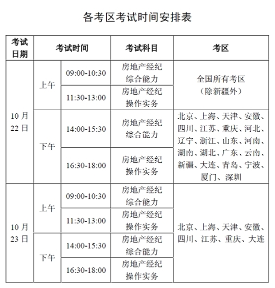 原定2016年10月15日、16日舉行的房地產經紀人協理資格考試調整為10月22日、23日舉行(各考區的考試時間安排見下表),準考證打印時間為10月17日至23日。每位考生均在半天內完成考試,具體考試時間、地點詳見準考證。
