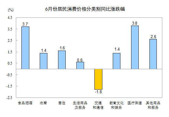 6月份,其他七大類(lèi)價(jià)格同比六漲一降。其中,醫(yī)療保健、其他用品和服務(wù)、居住、衣著、教育文化和娛樂(lè)、生活用品及服務(wù)價(jià)格分別上漲3.8%、2.6%、1.6%、1.4%、1.4%、0.6%;交通和通信價(jià)格下降1.8%。