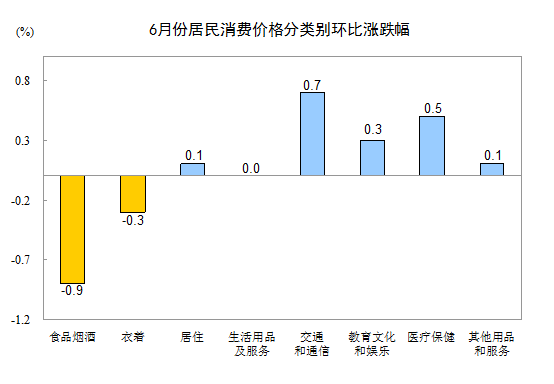 6月份,其他七大類(lèi)價(jià)格環(huán)比五漲一降一平。其中,交通和通信、醫(yī)療保健、教育文化和娛樂(lè)、居住、其他用品和服務(wù)價(jià)格分別上漲0.7%、0.5%、0.3%、0.1%、0.1%;衣著價(jià)格下降0.3%;生活用品及服務(wù)價(jià)格持平。