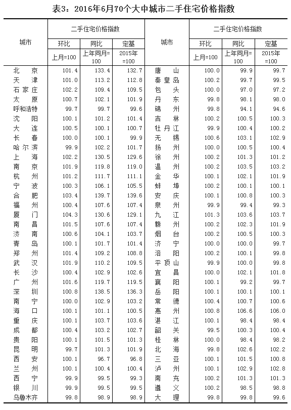 2016年6月份70個大中城市住宅銷售價格變動情況