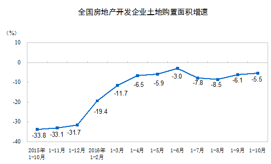 1-10月份,房地產(chǎn)開發(fā)企業(yè)土地購置面積16873萬平方米,同比下降5.5%,降幅比1-9月份收窄0.6個百分點;土地成交價款6764億元,增長16.7%,增速提高3.4個百分點。