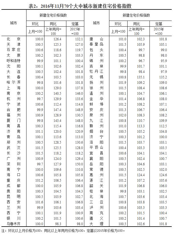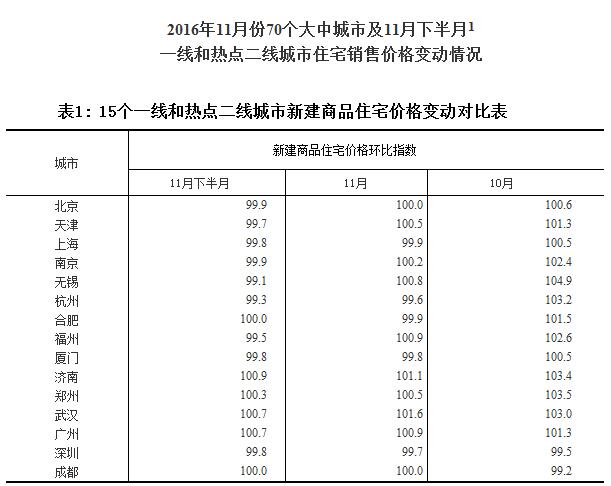 注:1、為深入反映房地產(chǎn)市場(chǎng)近期變化,國(guó)家統(tǒng)計(jì)局在做好11月份70個(gè)大中城市房?jī)r(jià)統(tǒng)計(jì)的同時(shí),又對(duì)其中15個(gè)一線和熱點(diǎn)二線城市11月下半月房?jī)r(jià)與11月上半月比較的變動(dòng)情況進(jìn)行了統(tǒng)計(jì)