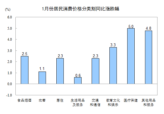 1月份,其他七大類價格同比均有所上漲。其中,醫療保健、其他用品和服務、教育文化和娛樂、居住、交通和通信、衣著、生活用品及服務價格分別上漲5.0%、4.8%、3.3%、2.3%、2.3%、1.1%和0.6%。