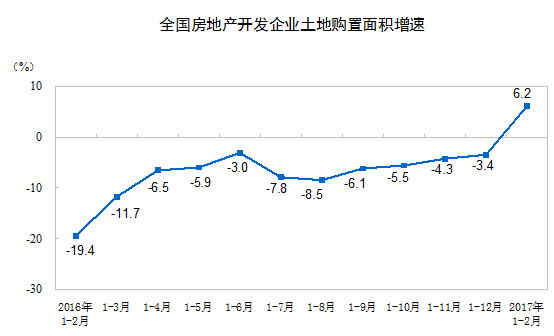 1-2月份,房地產開發企業土地購置面積2374萬平方米,同比增長6.2%,去年全年為下降3.4%;土地成交價款794億元,增長12.7%,增速回落7.1個百分點。