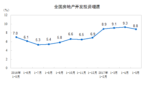 2017年1-5月份,全國房地產開發投資37595億元,同比名義增長8.8%,增速比1-4月份回落0.5個百分點。其中,住宅投資25423億元,增長10.0%,增速回落0.6個百分點。住宅投資占房地產開發投資的比重為67.6%。
