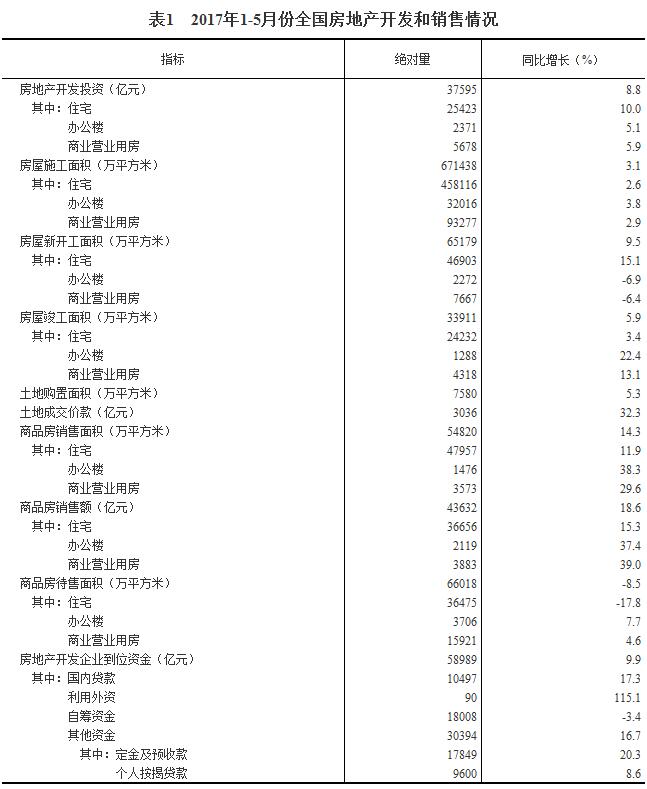 2017年1-5月份全國房地產開發投資和銷售情況