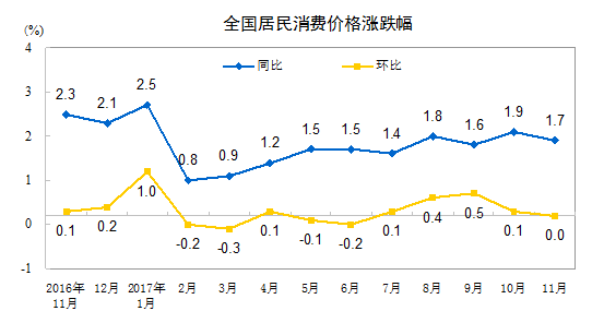 2017年11月份,全國居民消費價格同比上漲1.7%。其中,城市上漲1.8%,農村上漲1.5%;食品價格下降1.1%,非食品價格上漲2.5%;消費品價格上漲0.9%,服務價格上漲3.1%。1-11月平均,全國居民消費價格總水平比去年同期上漲1.5%。
